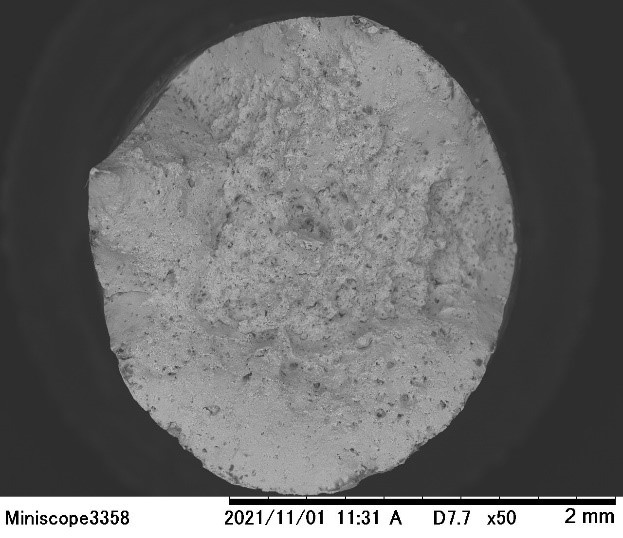 引張試験後のある2つの試験片の破断面をSEM(走査電子顕微鏡)で観察しました。