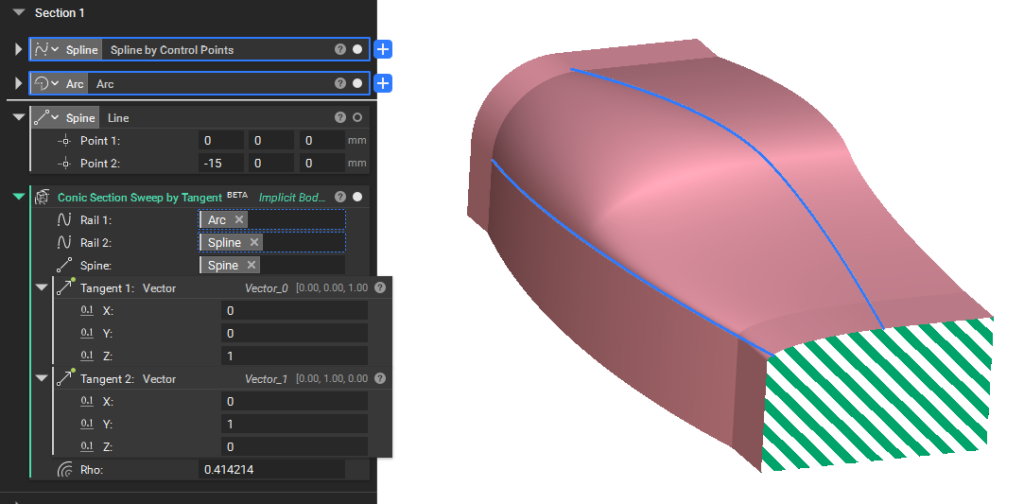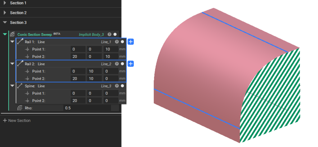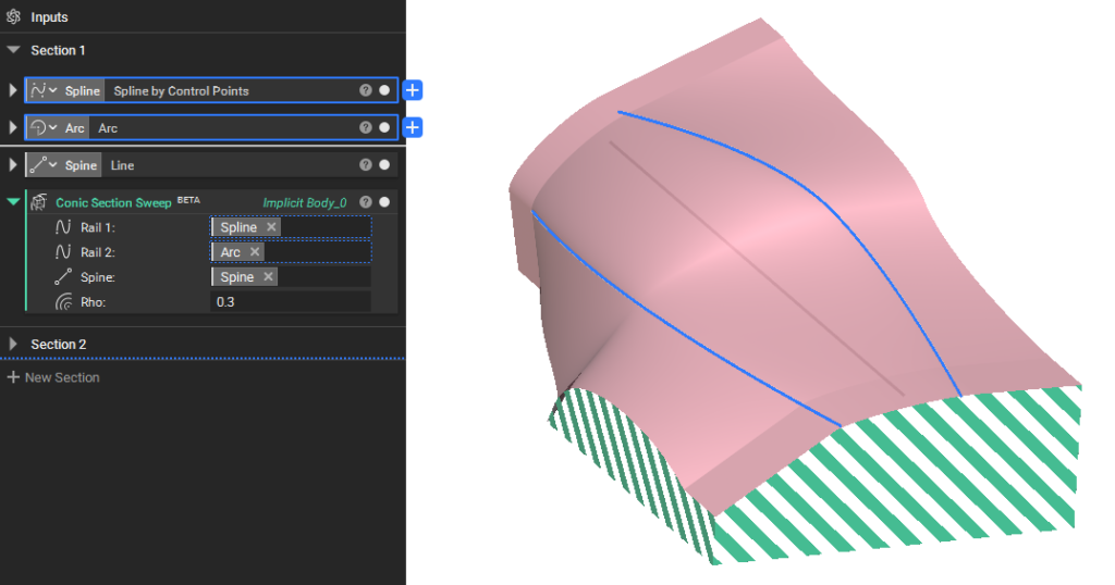 2つのカーブと直線から円錐断面のスイープによる流線形状を作成します。