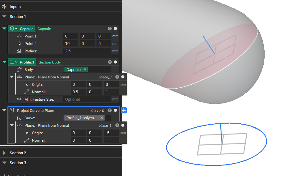 カーブを平面に投影します。断面プロファイルのプロパティからカーブを参照すれば断面形状の投影も可能です。